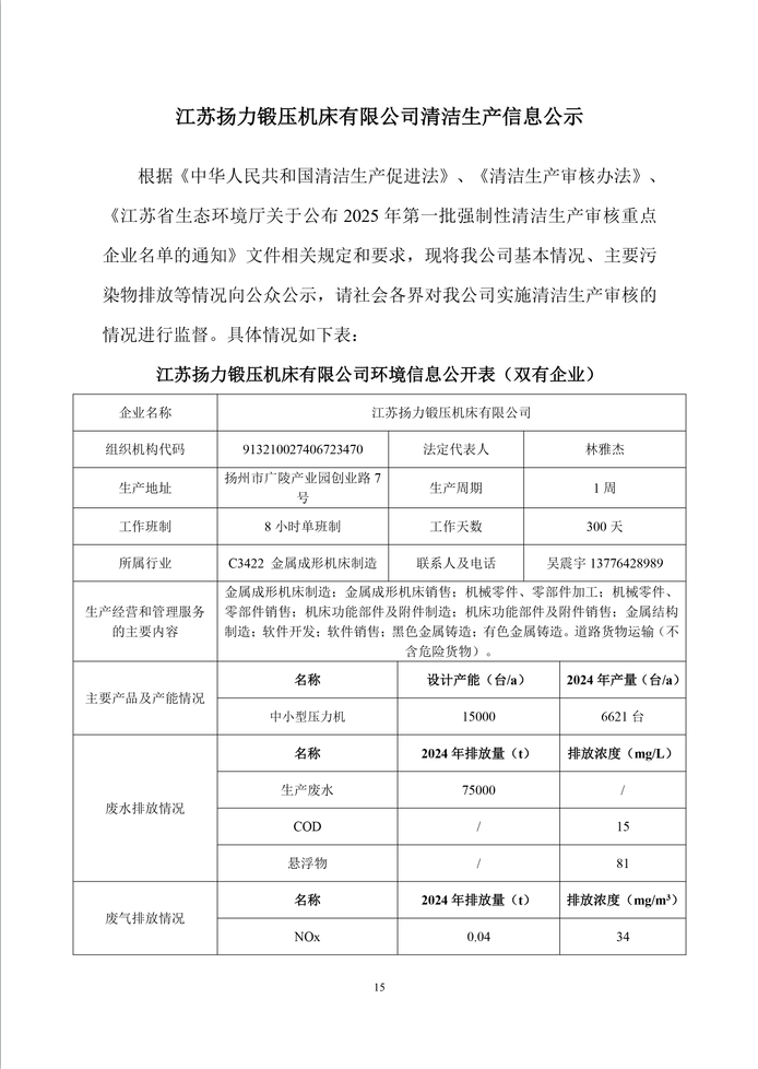 江蘇揚力鍛壓機床有限公司清潔生產審核信息公示